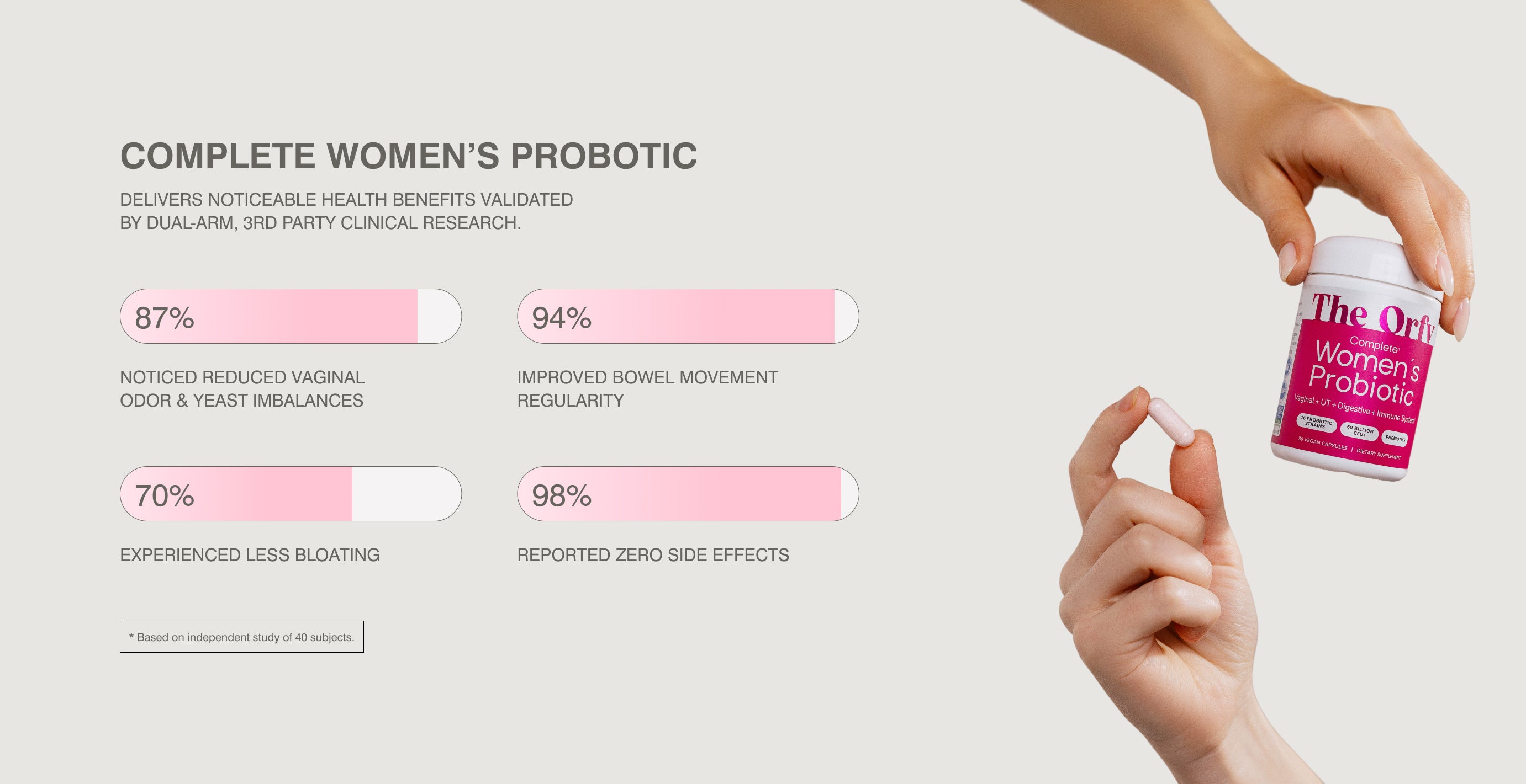 Backed by scientific research, each THE ORFY solution - from our Complete Women’s Probiotic to targeted vitamins and beyond - is carefully formulated with clinically studied ingredients that work synergistically. Studies show that 70% of the immune system is rooted in the gut, and a balanced microbiome is crucial for maintaining overall well-being, including hormonal balance and immune resilience. With THE ORFY, you’ll experience transformative, inside-out support designed specifically for women’s unique needs - so you can thrive every day.